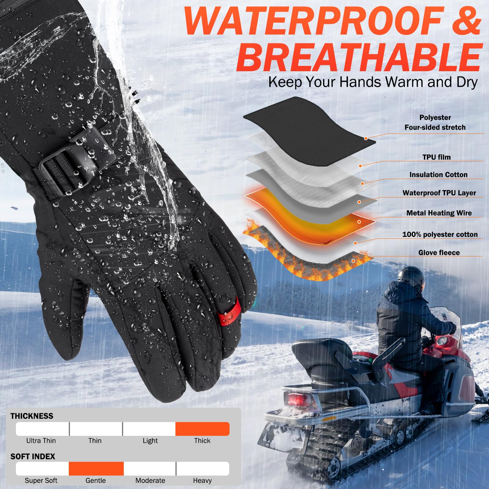 🔥【جنس مرغوب و ضد آب】این دستکشهای گرمشونده برقی از ۴ لایه تشکیل شدهاند. لایه بیرونی از جنس میکروفایبر ساخته شده است که ضد آب و مقاوم در برابر سایش است. لایه میانی از پارچه تاری متراکم و آستر فومی ساخته شده است. آستر داخلی از جنس پشم گوسفند است.