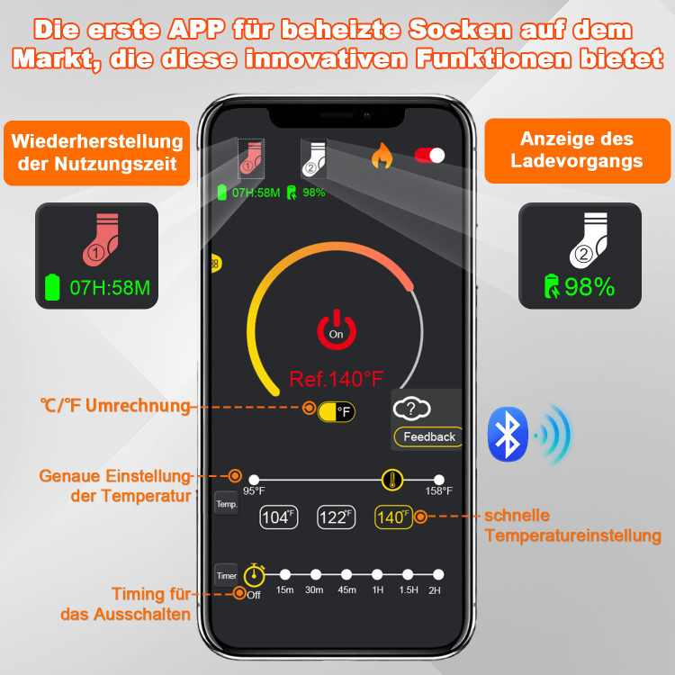 🔥 تنظیم دقیق دما و 6 تنظیم کنترل زمان: دمای جورابهای گرم شونده باتریدار را میتوان از طریق اپلیکیشن به طور دقیق در هر دمایی بین 95 تا 158 درجه فارنهایت تنظیم کرد. با قابلیت تایمر که در 6 بخش زمانی (15 دقیقه، 30 دقیقه، 45 دقیقه، 60 دقیقه، 90 دقیقه، 120 دقیقه) کار میکند. این جورابهای گرم مردانه میتوانند پس از زمان دلخواه شما به طور خودکار خاموش شوند.