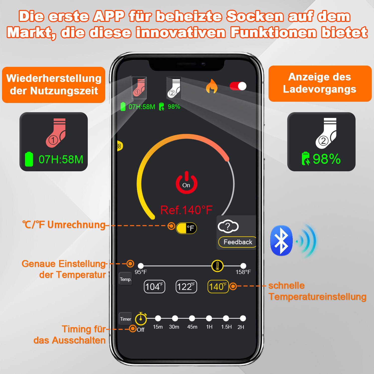 🔥 تنظیم دقیق دما و 6 تنظیم کنترل زمان: دمای جورابهای گرم شونده باتریدار را میتوان از طریق اپلیکیشن به طور دقیق در هر دمایی بین 95 تا 158 درجه فارنهایت تنظیم کرد. با قابلیت تایمر که در 6 بخش زمانی (15 دقیقه، 30 دقیقه، 45 دقیقه، 60 دقیقه، 90 دقیقه، 120 دقیقه) کار میکند. این جورابهای گرم مردانه میتوانند پس از زمان دلخواه شما به طور خودکار خاموش شوند.