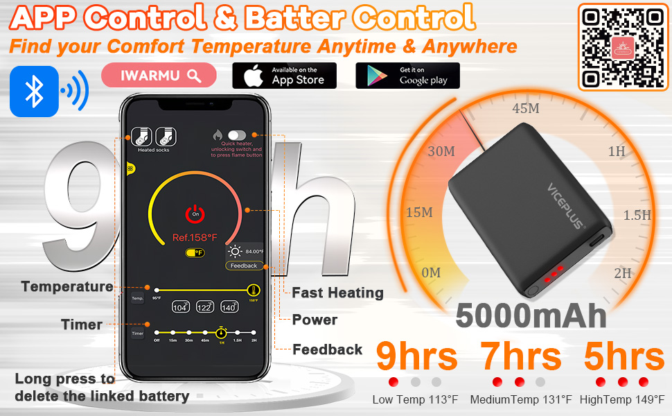 🔥 کنترل هوشمند از طریق اپلیکیشن: جورابهای گرم شونده VICEPLUS مجهز به یک اپلیکیشن مخصوص تلفن همراه هستند که به شما امکان میدهد به راحتی و با دقت عملکردهای کنترل دما و زمان را تنظیم کنید و به خدمات مشتری دسترسی داشته باشید. دیگر نیازی به خم شدن و تقلا برای بالا کشیدن شلوارتان در برف برای پیدا کردن دکمه داخل جورابهای گرم شونده نیست.