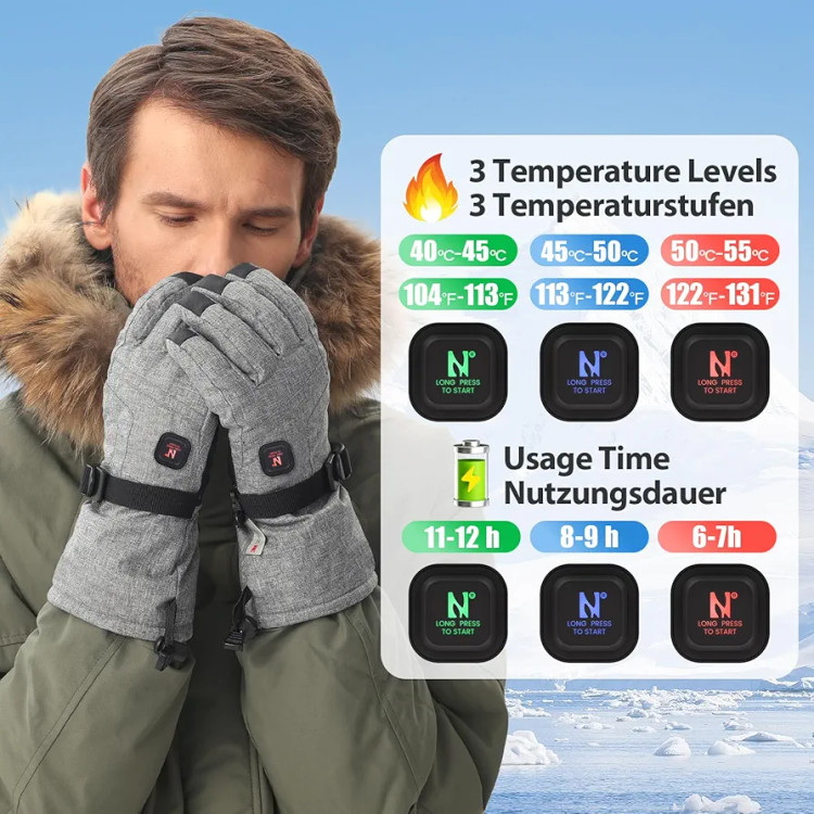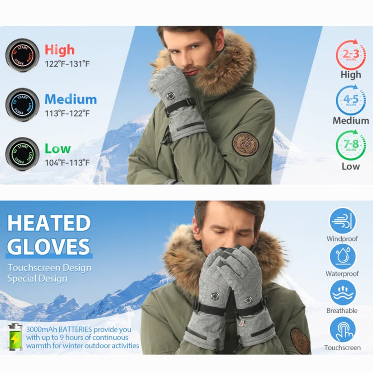 🔥【باتری قابل شارژ 7.4 ولت 3000 میلیآمپر ساعت】 - دستکشهای گرم شونده شامل یک جفت باتری قابل شارژ لیتیوم-یونی هستند که پس از شارژ کامل میتوانند 5 تا 10 ساعت دوام بیاورند و دارای 3 حالت تنظیم دما هستند. دستکشهای زمستانی عالی برای فعالیتهای داخل و خارج از منزل. به هوای تازه بروید و از زمستان نهایت لذت را ببرید!