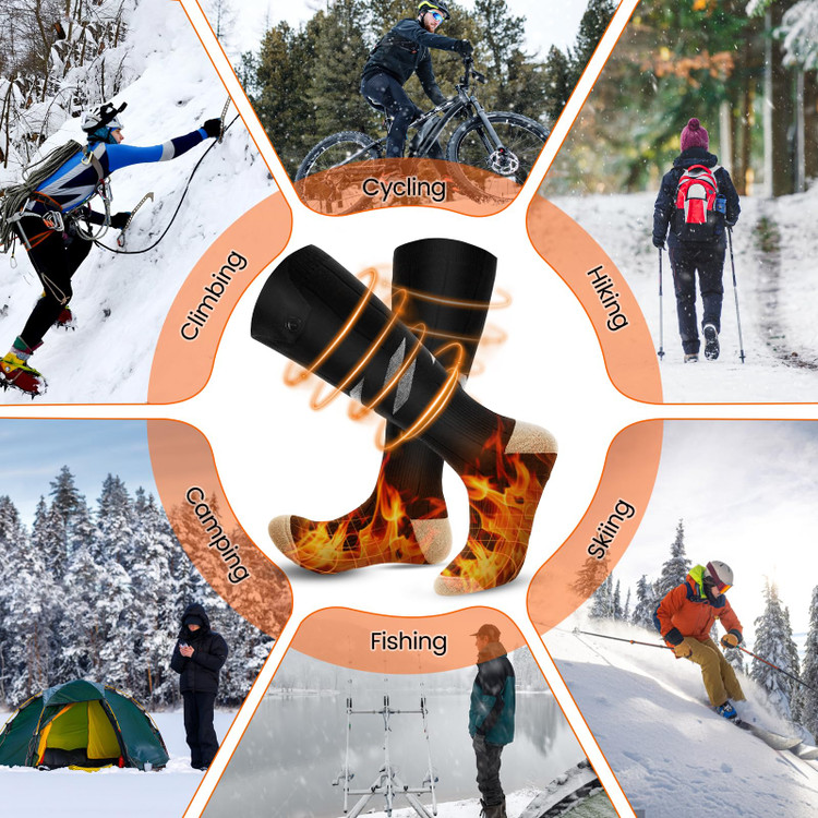🔥【قابل استفاده گسترده】 جورابهای گرمایشی با ۲ باتری قابل شارژ ۷۰۰۰ میلیآمپرساعت ارتقا یافته تغذیه میشوند که میتوانند ۵ ساعت در بالاترین تنظیمات گرما و ۱۲ ساعت در پایینترین تنظیمات گرما دوام بیاورند. این جورابهای برقی با شارژ Type-C به مدت ۶ ساعت میتوانند شما را فوراً گرم کنند. مناسب برای سفرهای طولانی و ورزشهای فضای باز، مانند اسکی زمستانی، اسنوموبیل سواری، پارو کردن برف، موتورسواری، ماهیگیری، کمپینگ، صخره نوردی، پیادهروی، شکار، کوهنوردی و غیره. سرما را فراموش کنید و بیشتر روی لذت بردن از اوقات فراغت در فضای باز تمرکز کنید.