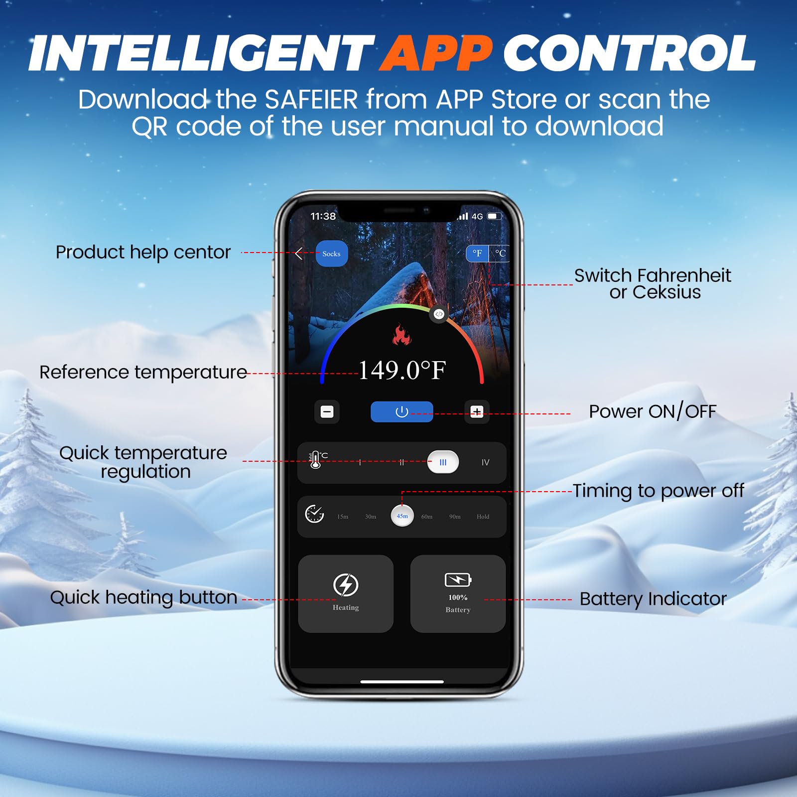 🔥【کنترل هوشمند جورابهای گرمشونده با اپلیکیشن】کد QR روی دفترچه راهنما را اسکن کنید یا اپلیکیشن "SAFEIER" را از فروشگاه اپلیکیشن دانلود کنید، اپلیکیشن را به جورابهای گرمشونده برقی متصل کنید و سپس میتوانید دما و زمان گرم شدن را از طریق تلفن خود کنترل کنید. بنابراین لازم نیست خم شوید و چکمههایتان را دربیاورید تا دکمههای روی جورابها را لمس کنید. استفاده از این اپلیکیشن بسیار آسان است و هنگام حرکت برای فعالیتهای فضای باز مفید است.