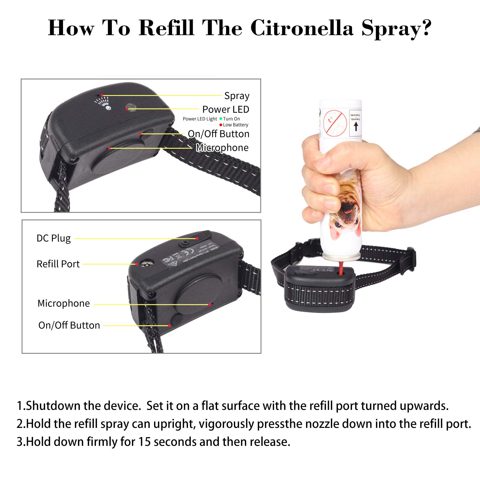 🐶【ظرفیت بالا 】 - 20 تا 30 اسپری در هر بار پر کردن کامل و 300-400 اسپری در هر قوطی. (اسپری سیترونلا شامل میشود)، نحوه پر کردن اسپری سیترونلا - قوطی اسپری پر کردن را به صورت عمودی نگه دارید و محکم و با قدرت (مهم) نازل را به داخل دریچه پر کردن فشار دهید تا احساس فرو رفتن کنید. 15 ثانیه نگه دارید و سپس رها کنید.