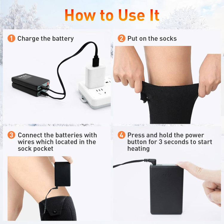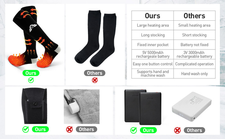 🔥 [باتری با ظرفیت بالا ۵۰۰۰ میلیآمپر ساعت] جورابهای گرمایشی برقی با یک باتری ۵ ولتی ۵۰۰۰ میلیآمپر ساعت با ظرفیت بالا تغذیه میشوند و میتوانند به طور مداوم به مدت ۳ تا ۷ ساعت کار کنند. پس از فشار طولانی مدت دکمه باتری به مدت ۳ ثانیه، چراغ قرمز روشن میشود و جورابهای گرمایشی برقی به حالت گرمایش تغییر میکنند و به سرعت گرما تولید میکنند تا شما را گرم نگه دارند.