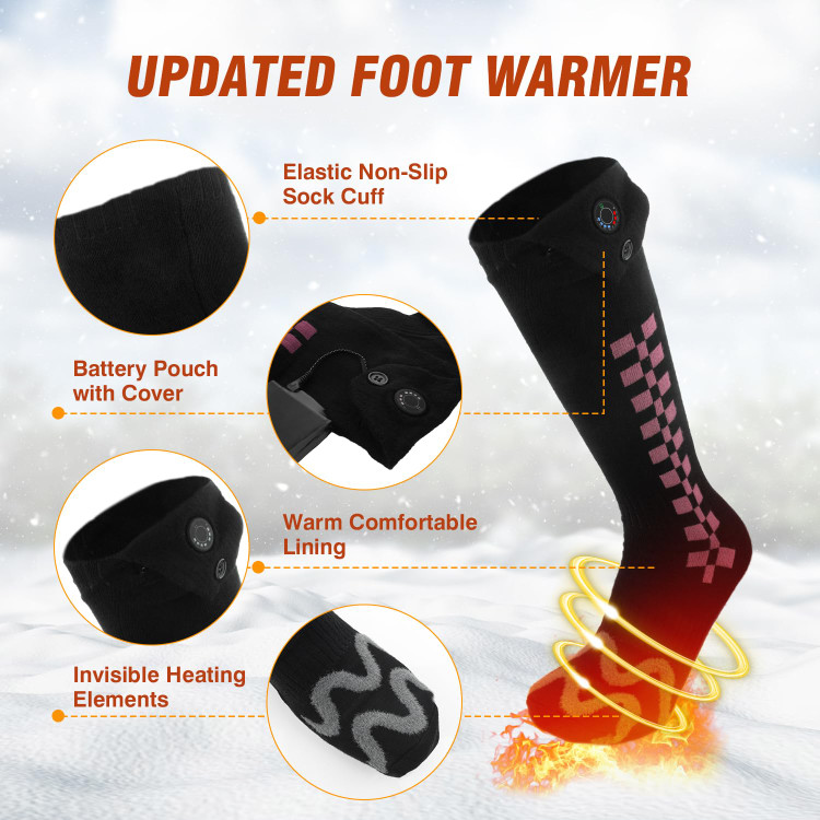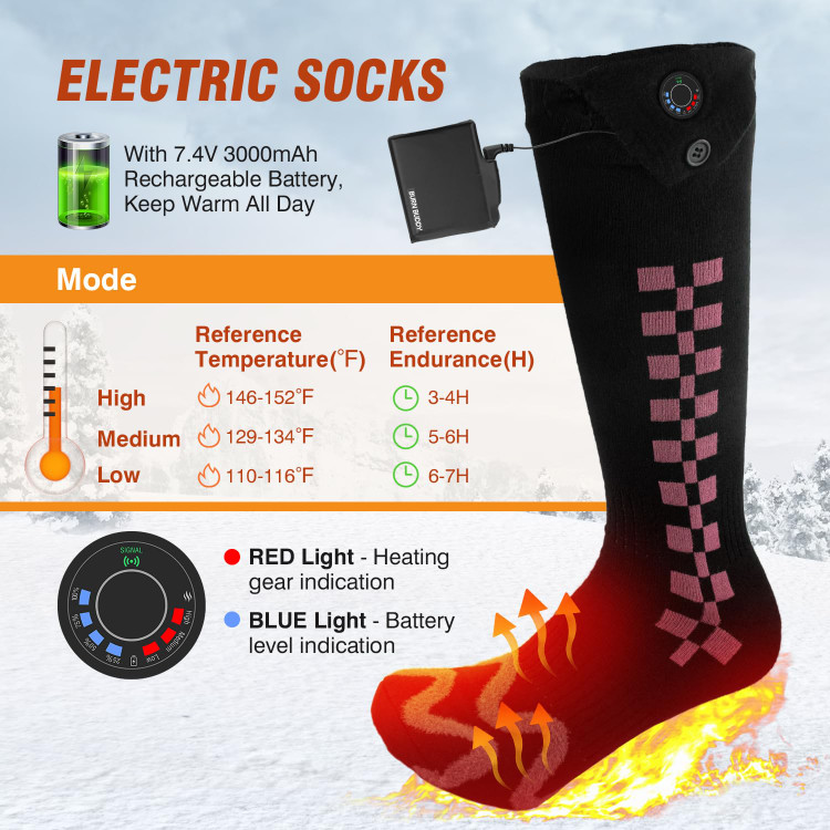 🌞【پارچه جوراب گرم شونده درجه یک】جورابهای گرم شونده از ۴ لایه پارچه درجه یک ساخته شدهاند که بسیار نرم و قابل تنفس هستند و هیچ احساس جسم خارجی ندارند. المنتهای گرم کننده تمام انگشتان پا را میپوشانند و گرمای اطراف آن به سرعت گرما را به پاها منتقل میکند و تمام بدن شما را گرم میکند. میتوانید تمام روز گرم بمانید و از فعالیتهای زمستانی خود با جورابهای گرم شونده برقی برای آقایان و خانمها لذت ببرید.