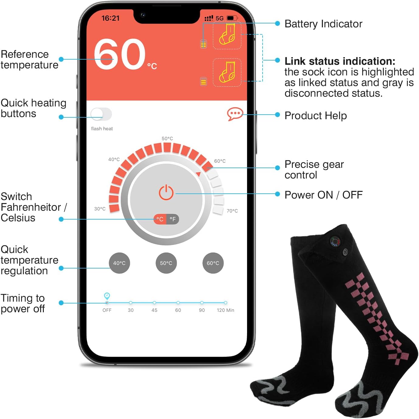 🌞【کنترل دقیق دما】جورابهای گرم مردانه را میتوان با اتصال به یک برنامه، دمای (۹۵ تا ۱۶۷ درجه فارنهایت) را تنظیم کرد، با کشیدن انگشت میتوانید دقیقاً دمای مورد نیاز خود را انتخاب کنید، محدود به یک سطح دمای ثابت پایین، متوسط و بالا نیست. جورابهای چپ و راست را میتوان به طور جداگانه و بدون درآوردن جورابهای گرم زنانه کنترل کرد. همچنین میتوانید دما را با دکمههای روی جورابهای زمستانی تنظیم کنید، لطفاً برای جزئیات بیشتر به دفترچه راهنما مراجعه کنید.