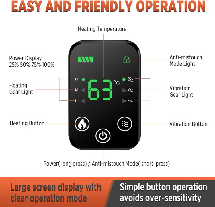 🔥 کنترل آسان برای استفاده آسان: دکمههای تک لمسی و یک صفحه نمایش LED شفاف، عملکرد را ساده میکند. این محصول با قابلیت پیچیدن ایمن به شما این امکان را میدهد که با خیال راحت چند کار را همزمان انجام دهید - تمیز کنید، کار کنید یا استراحت کنید و در عین حال درد مفاصل را تسکین دهید.