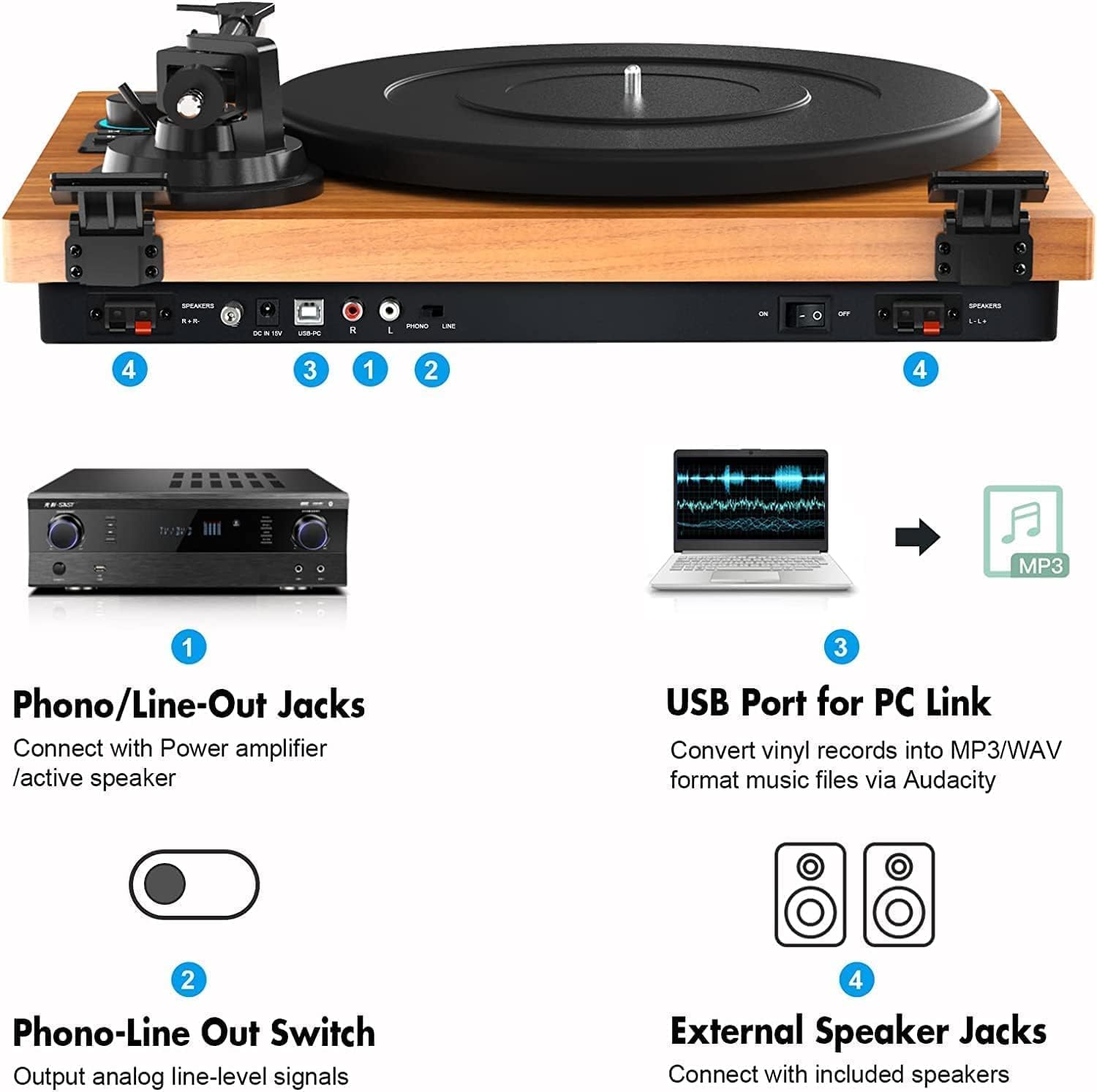 ۱. پخشکنندهی برتر: گرامافون چوبی سیستم هایفای، دارای خط فونو قابل تعویض داخلی، امکان اتصال به بلندگوهای هایفای موجود در دستگاه یا بلندگوهای خارجی خودتان را از طریق کابلهای خروجی دوگانه RCA فراهم میکند، سیم اتصال به زمین نیز به شما این امکان را میدهد که سیم اتصال به زمین خانهتان را به سیم اتصال به زمین این محصول متصل کنید، که میتواند تداخل صدا را به طور مؤثر کاهش دهد.