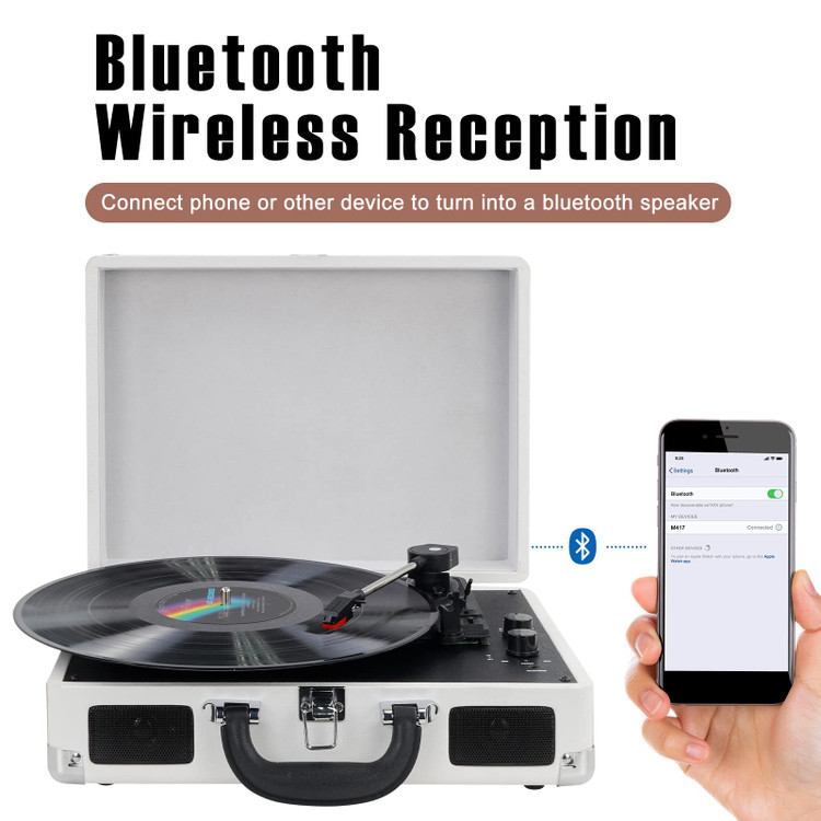 گرامافون وینیل چمدانی بلوتوث، قابل حمل، دارای بلندگوهای داخلی، شامل قلم اضافی، خروجی RCA، ورودی AUX