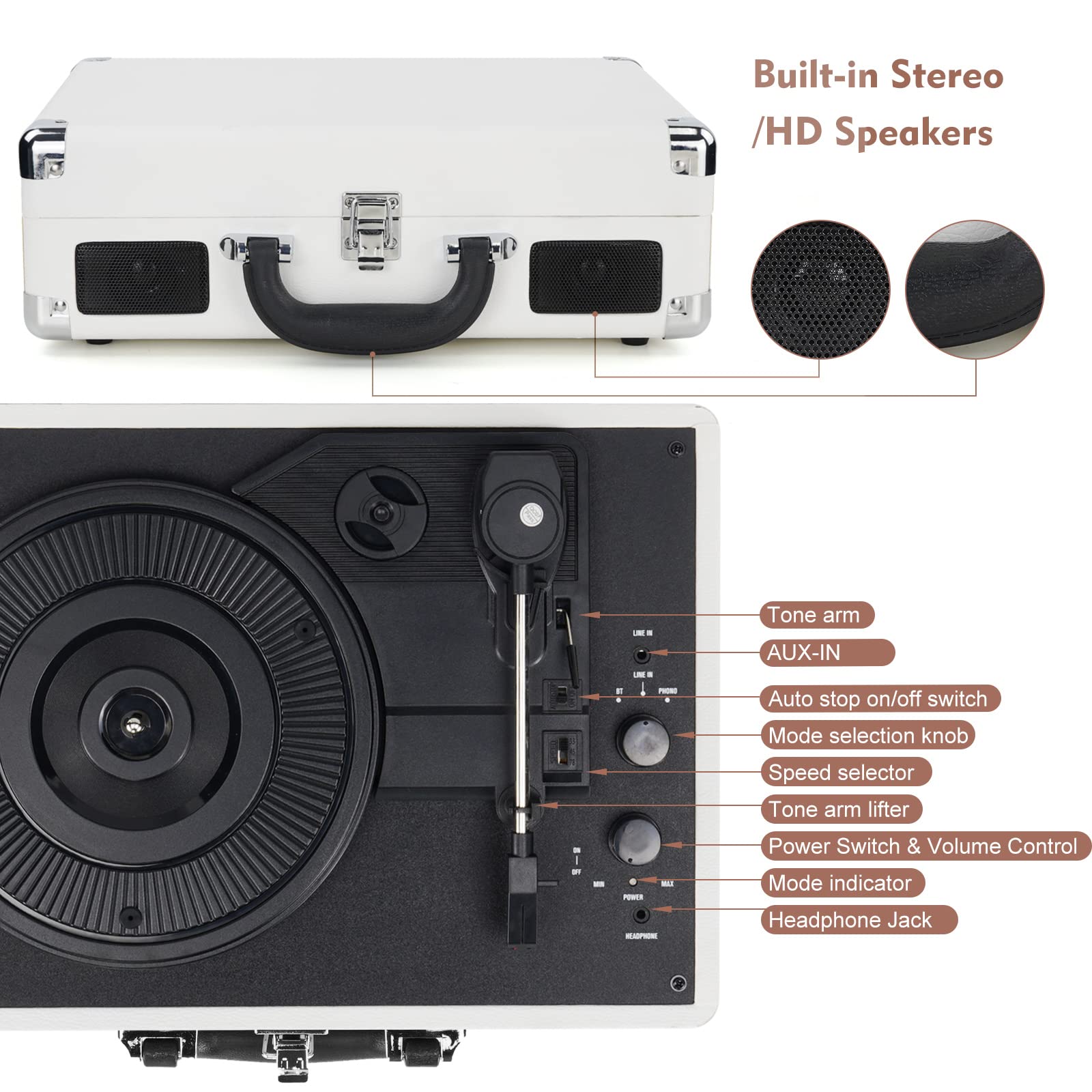 گرامافون وینیل چمدانی بلوتوث، قابل حمل، دارای بلندگوهای داخلی، شامل قلم اضافی، خروجی RCA، ورودی AUX