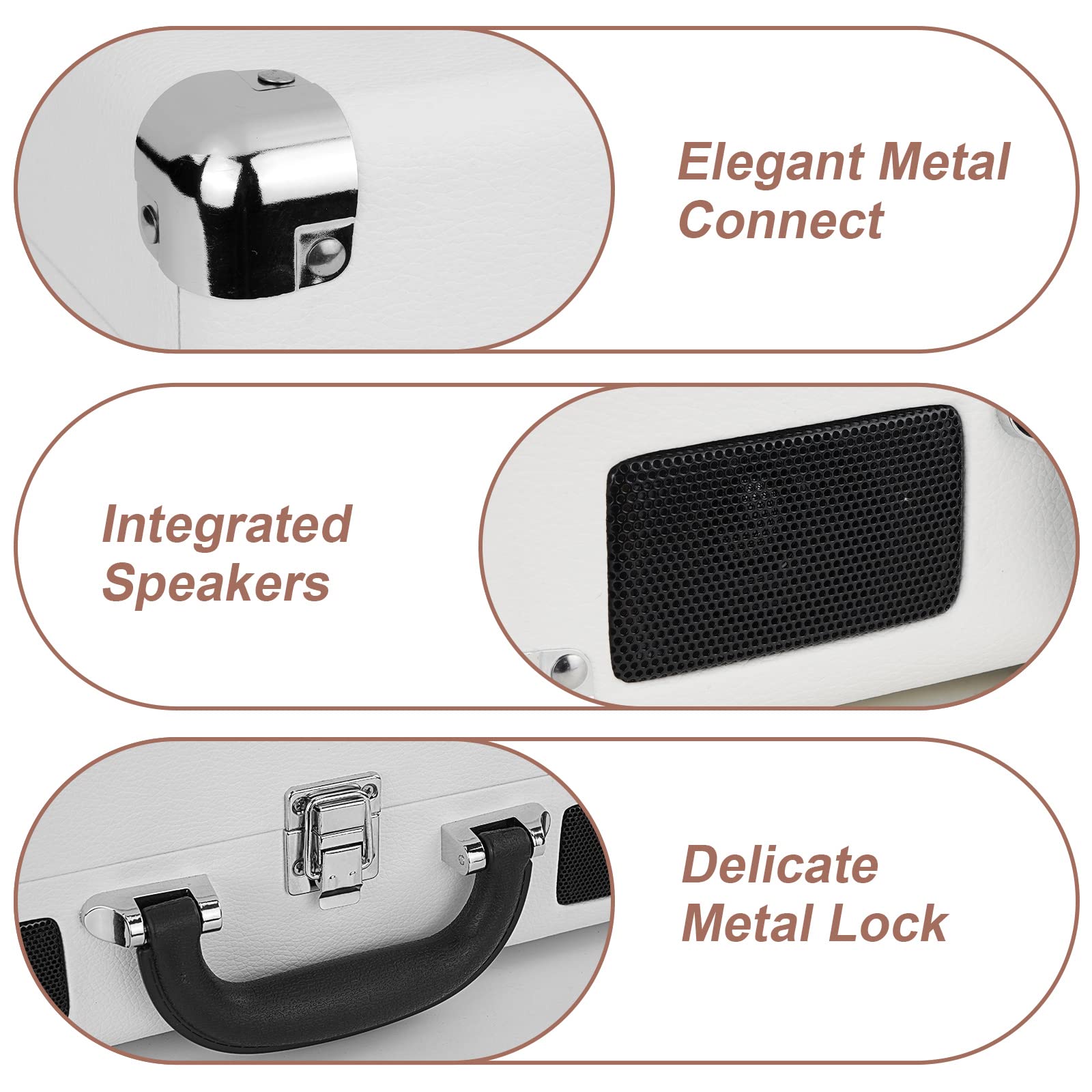 ✅️【شیک و قابل حمل】 با ترکیبی از طراحی رترو و مدرن، بستهای فلزی کرومی نفیس و ظاهر بافتدار نفیس، پخشکننده وینیل با سبک رترو بهترین انتخاب برای کلکسیونرها است. طراحی چمدانی قابل حمل با روکش بیرونی چرم مشکی کلاسیک برای اتاق نشیمن، اتاق خواب، دفتر کار عالی است.