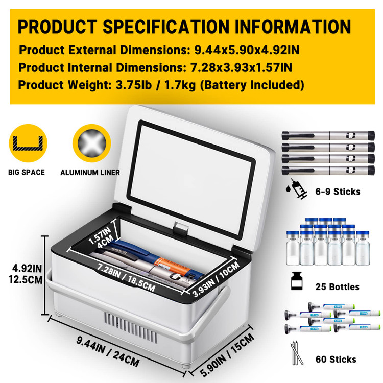 🍀 صفحه نمایش LED کنترل لمسی دما؛ قابل حمل؛ خنک کننده سریع 0 تا 8 درجه؛ استفاده آسان. شارژ کامل باتری به مدت 7 ساعت میتواند زمان کار بیشتری را فراهم کند! کیف مسافرتی خنک کننده انسولین میتواند 6 تا 9 قلم انسولین یا 25 بطری یا 60 بار پر کردن مجدد را در خود جای دهد.