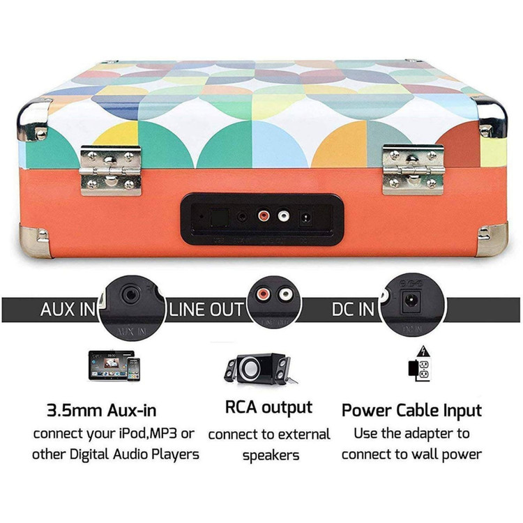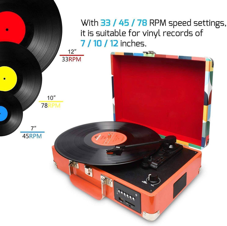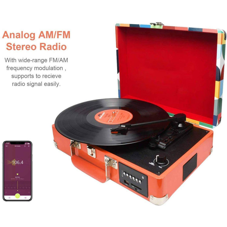 گرامافون بلوتوثی،گرامافون ۳ سرعته، بلندگوهای استریوی داخلی، تبدیل وینیل به کارت حافظه/USB و رادیو AM/FM، طراحی چمدانی