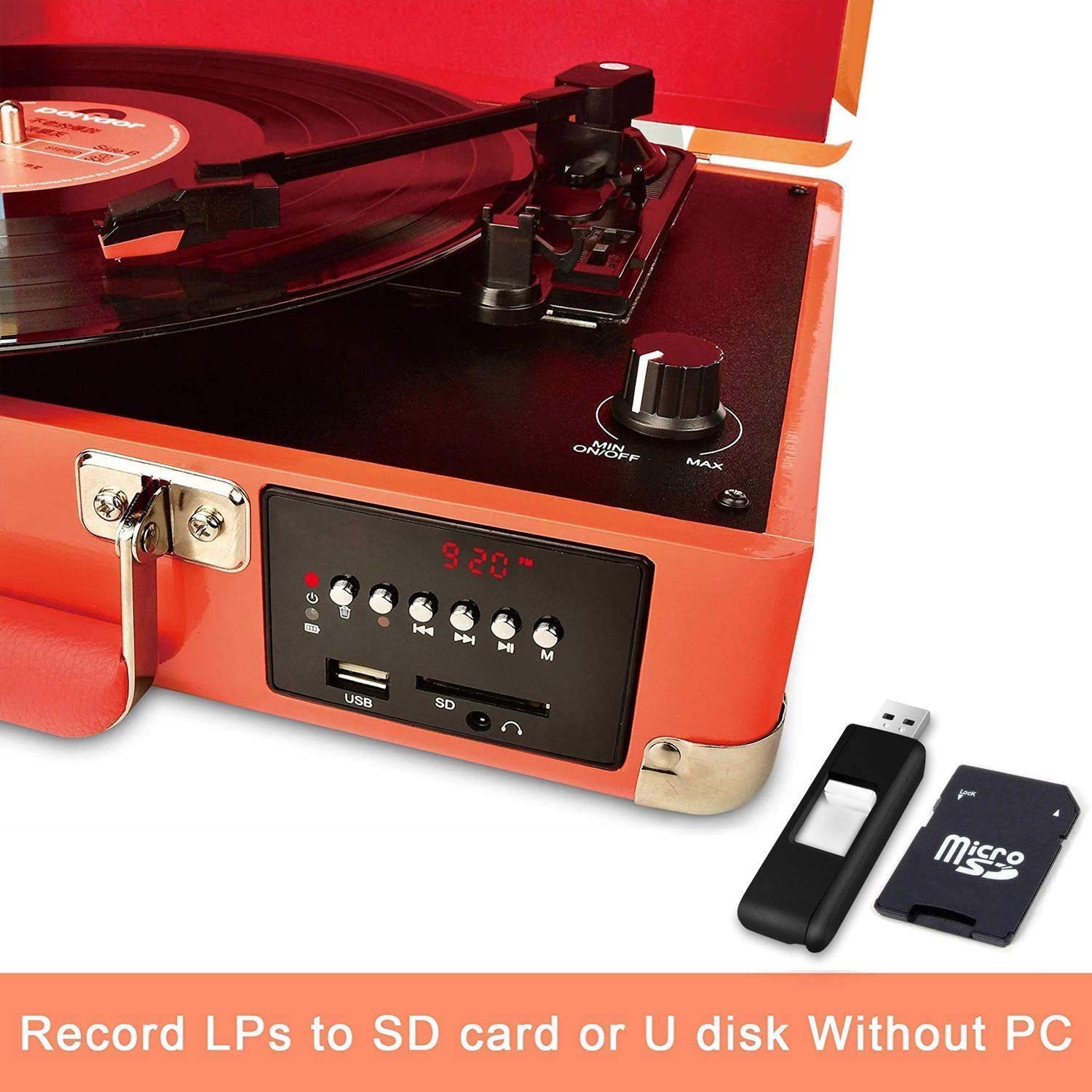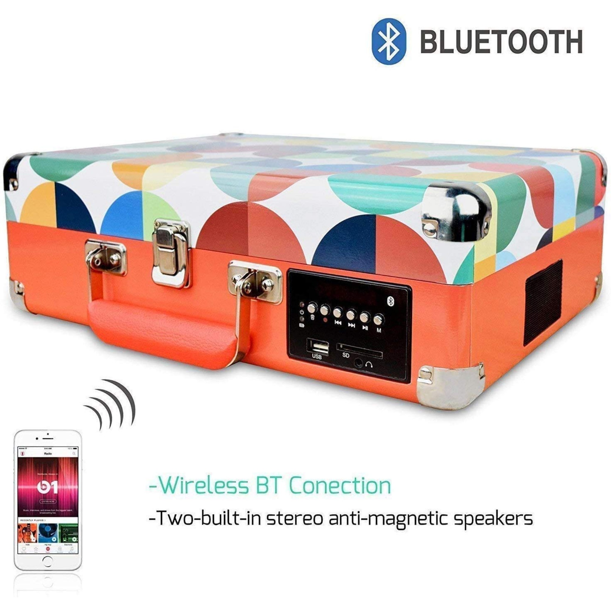 گرامافون بلوتوثی،گرامافون ۳ سرعته، بلندگوهای استریوی داخلی، تبدیل وینیل به کارت حافظه/USB و رادیو AM/FM، طراحی چمدانی