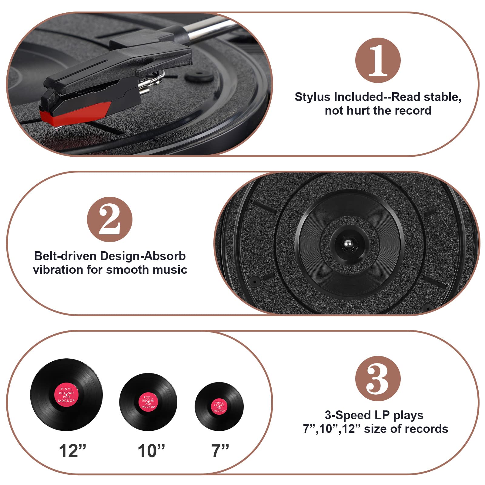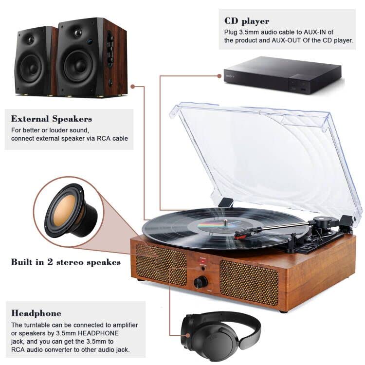 ✅️【۳ سرعت و ۳ اندازه صفحه موجود است】پشتیبانی از صفحههای گرامافون سه سرعته (۳۳-۱/۳، ۴۵ و ۷۸ دور در دقیقه)، از جمله آداپتور ۴۵ دور در دقیقه. سازگار با ۳ اندازه صفحه (۷ اینچ، ۱۰ اینچ و ۱۲ اینچ). استفاده آسان، راهاندازی و کار با آن ساده است.