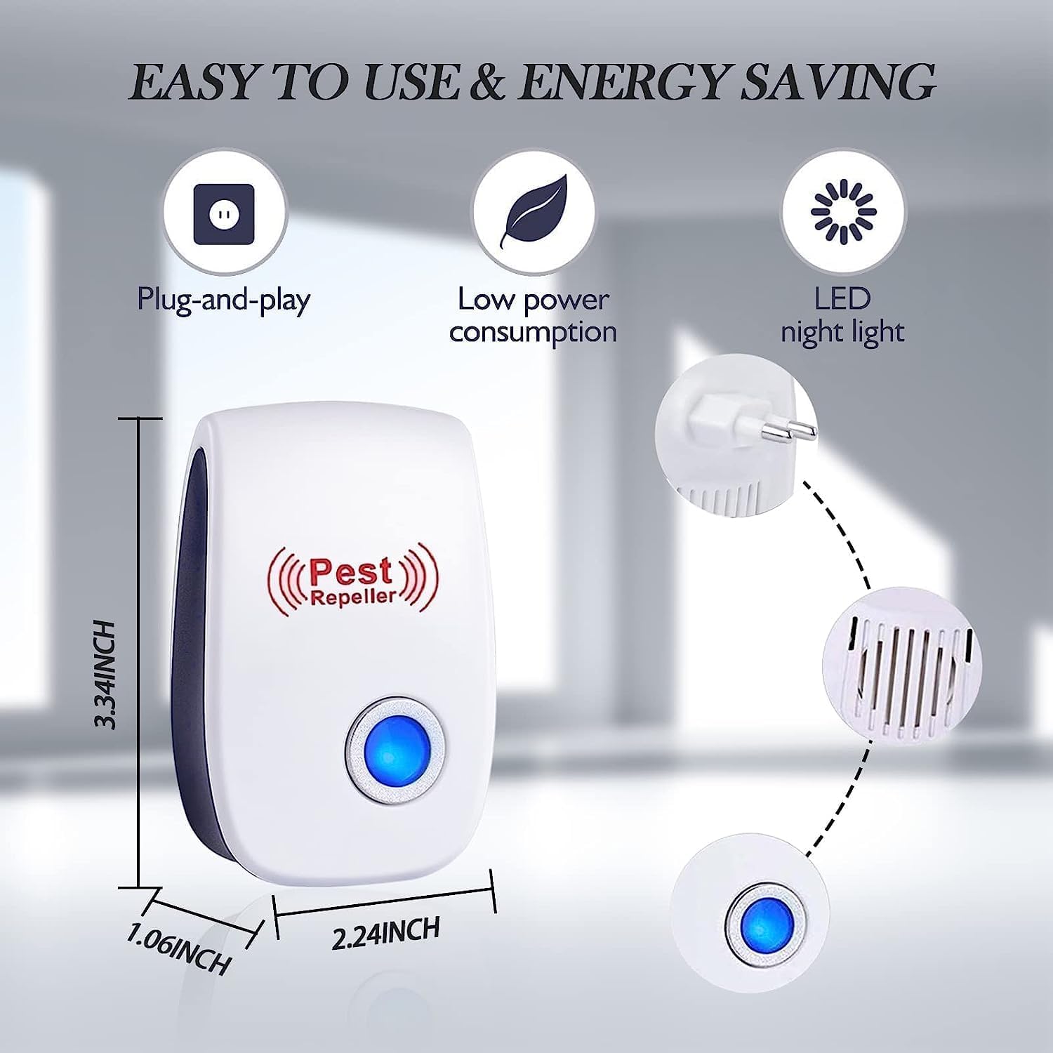🍀 مکانهای کاربردی مختلف: این دستگاه کنترل آفات اولتراسونیک میتواند به شما کمک کند تا تمام آفات مانند عنکبوت، موش، پشه، موش صحرایی، سوسک، مورچه، مار و غیره را دور کنید. مناسب برای آشپزخانه، اتاق نشیمن، اتاق خواب، حمام، انبار و زیرزمین. بیصدا: امواج فراصوتی که این دستگاه دفع حشرات ارسال میکند، بسیار فراتر از محدوده شنوایی انسان است. از یک خواب آرام و بدون آفت و بدون هیچ گونه نگرانی از سر و صدا لذت ببرید و به خانواده خود کمک کنید تا بدون سر و صدا خواب خوبی داشته باشند.