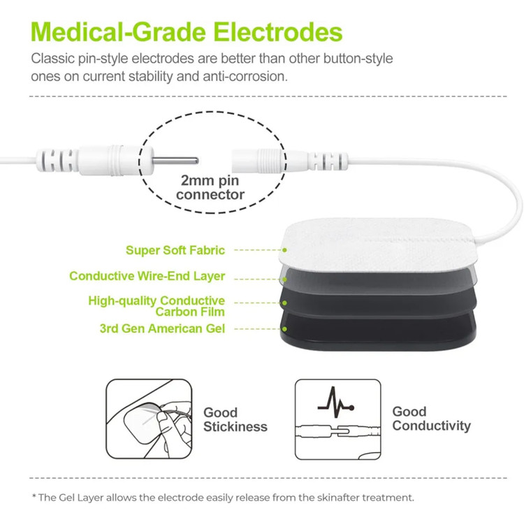 🍀 پدهای دستگاه TENS ارتقا یافته: ژل جامد با امپدانس پایین به چسب آمریکایی پیشرو در صنعت ارتقا یافته است که میتواند عملکرد چسبندگی عالی و تمیز کردن آسان پس از 45 بار استفاده را برای طول عمر بیشتر فراهم کند. سیمها و الکترودهای رابط استاندارد 2 میلیمتری کلاسیک هستند و معمولاً در حوزه پزشکی استفاده میشوند، که پیدا کردن لوازم جانبی سازگار را برای شما آسانتر میکند.