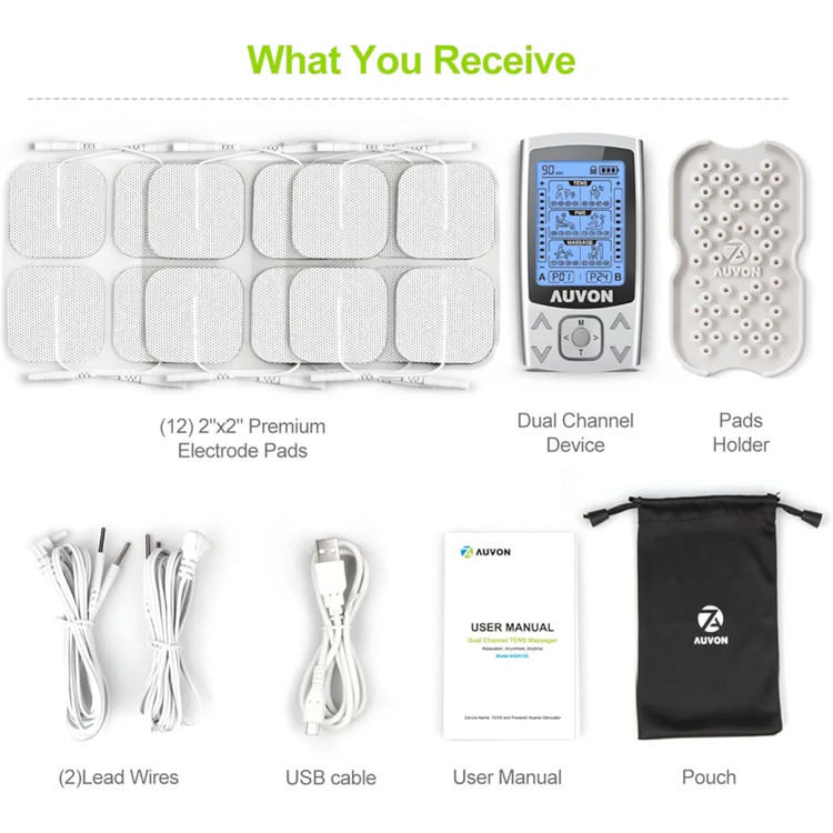 🍀 آنچه دریافت میکنید: 1 دستگاه TENS دو کاناله AUVON، 12 عدد پد الکترود 5 سانتیمتر در 5 سانتیمتر، 2 سیم رابط (سیم 1/2)، 1 کابل USB، 1 کیسه، 1 دفترچه راهنمای