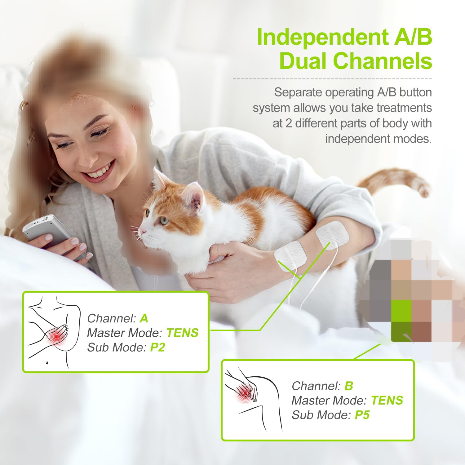 🍀 کانال دوگانه مستقل: میتوانید حالتها و سطوح مختلفی را برای کانال A و کانال B انتخاب کنید. به عنوان مثال، میتوانید حالت P1 را در کانال A با سطح شدت 3 برای شانه خود انتخاب کنید. در حالی که در کانال B، حالت P5 با شدت قویتر تنظیم شده روی سطح 9 روی پشت شما به عنوان یک محرک الکتریکی کمر اجرا میشود.