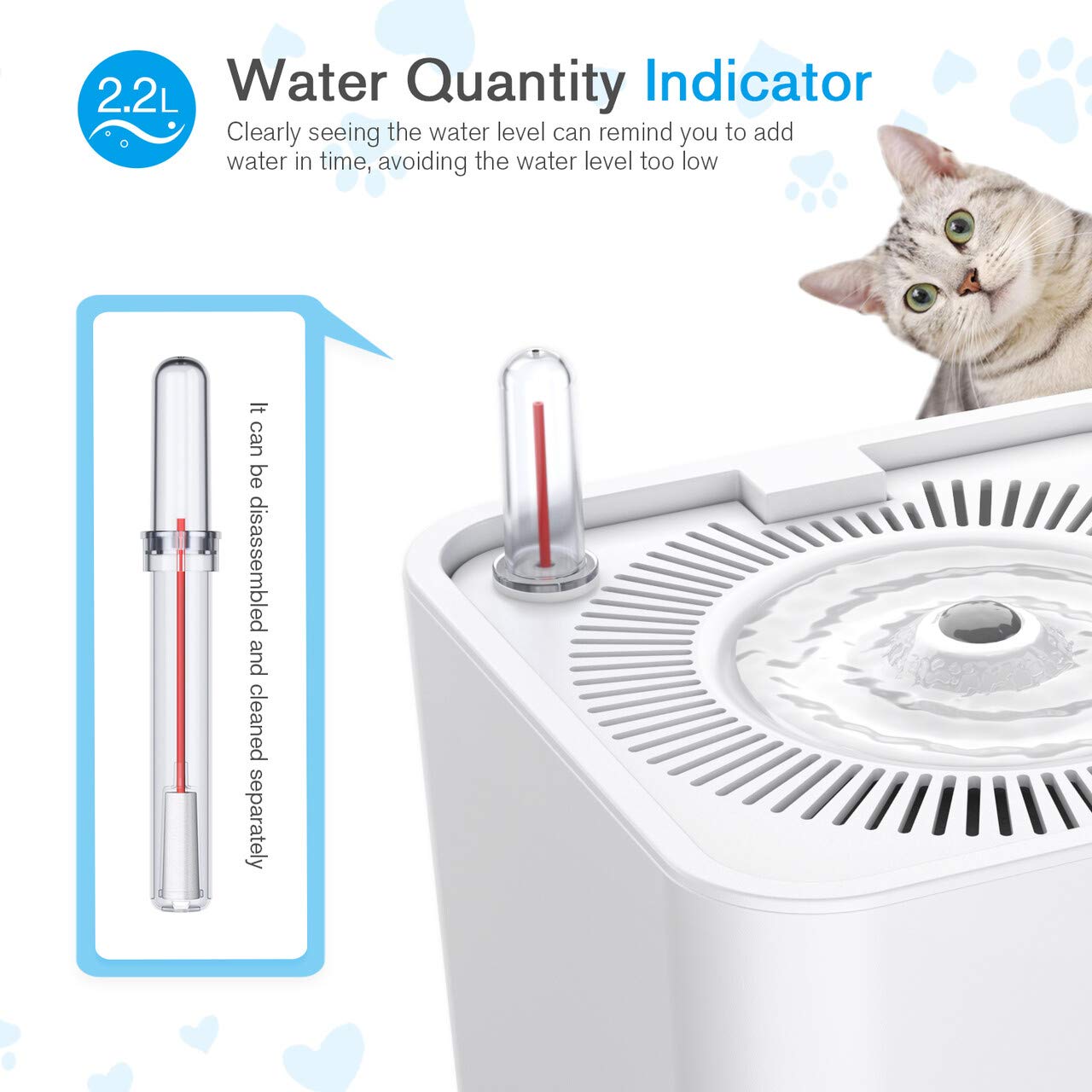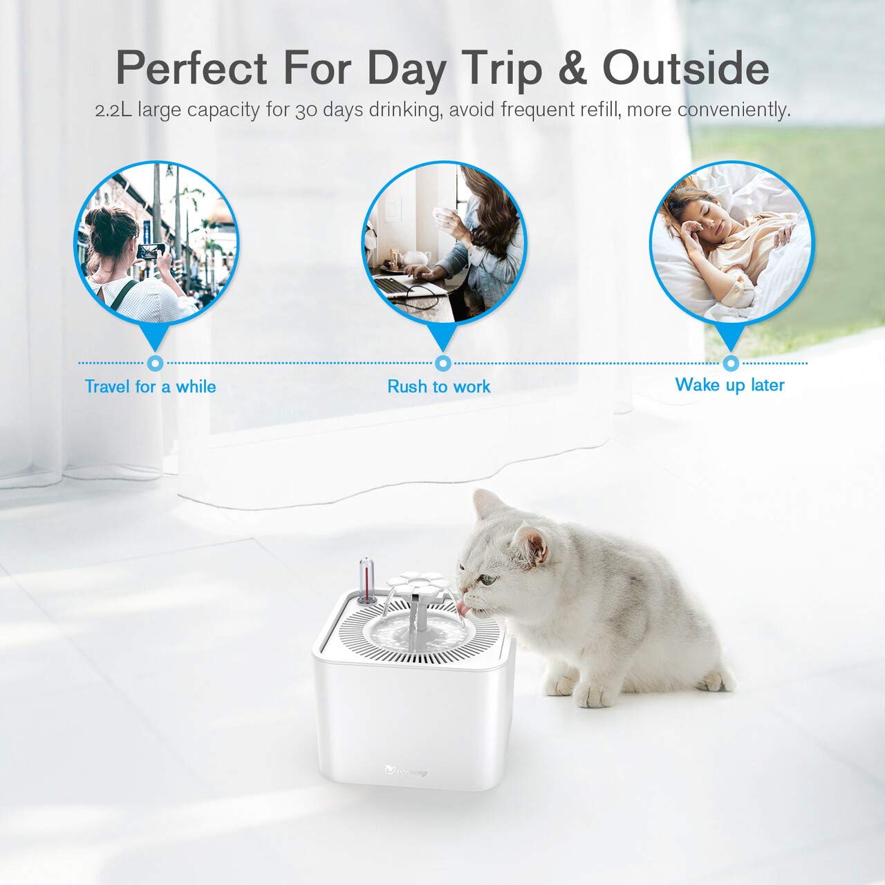 ✅️ ظرفیت 2.2 لیتر و 3 سبک نوشیدن آب، جهت 360 درجه برای نوشیدن. AC100-240V 50/60Hz0.15A، خروجی USB 5V1A، با کابل 1.45M، پمپ آب 5V/1W