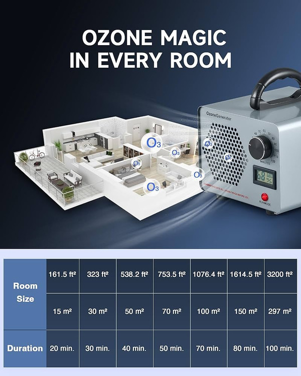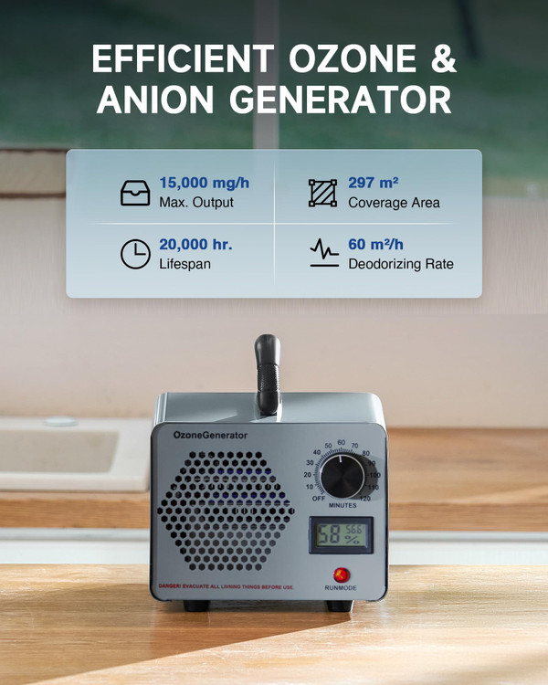 🍀 بوزدایی قدرتمند: با حداکثر تولید ازن ۲۵۰۰۰ میلیگرم در ساعت و فن ۲۸۰۰ دور در دقیقه، این دستگاه ازن میتواند فضایی تا ۲۹۵ متر مربع را به راحتی بوزدایی کند.