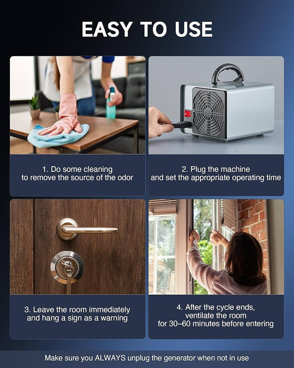 🍀 توجه: به دلایل ایمنی، از این ژنراتور اوزون فقط در فضاهای خالی استفاده کنید. برای اطمینان از رفاه حال همه، حداقل ۳۰ دقیقه پس از پایان تولید اوزون صبر کنید و سپس به افراد یا حیوانات خانگی اجازه دهید به محل برگردند.