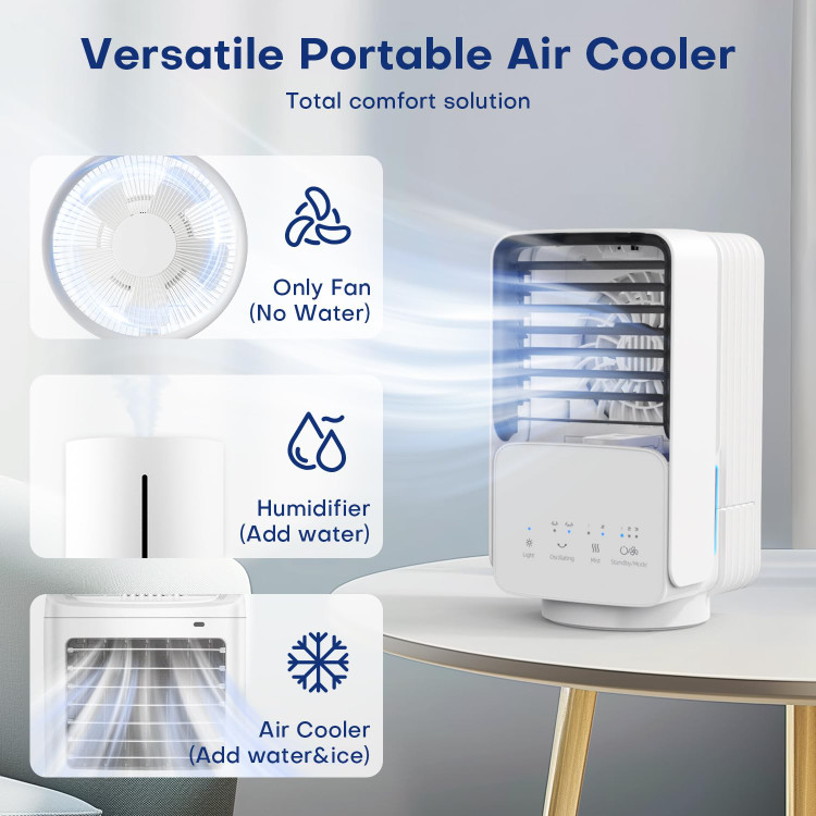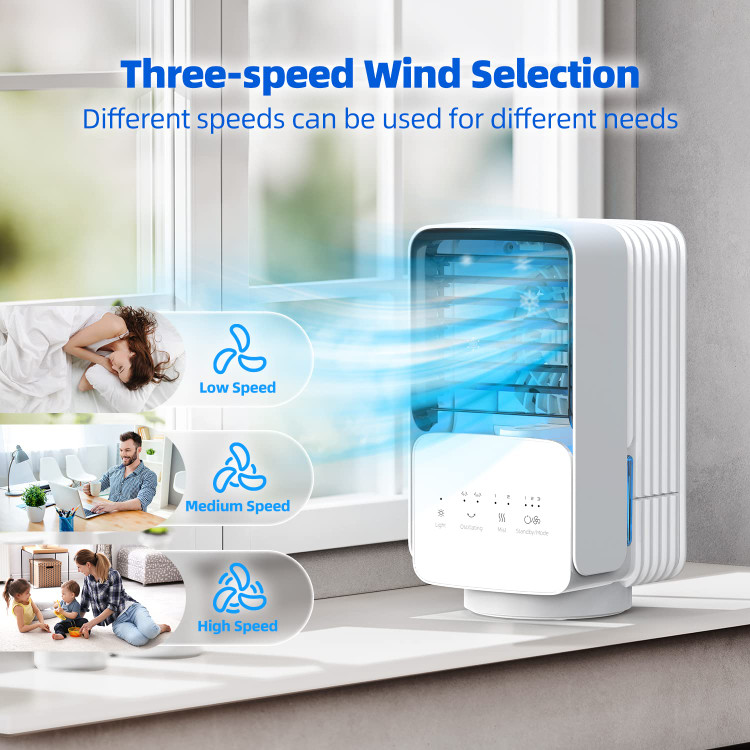 چرخش 60 درجه/120 درجه، 3 سرعت، 2 حالت مه، کولرکوچک با چراغ LED