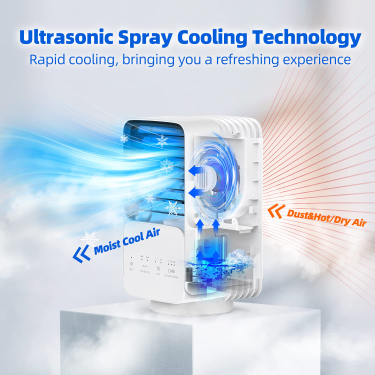 ☃️ فناوری خنککننده منحصر به فرد: کولر کوچک از فناوری مه اولتراسونیک برای اتمیزه کردن آب به صورت مه ریز استفاده میکند که سپس توسط فن توزیع شده و هوای خنک و مرطوب را فراهم میکند. میتوانید از بین حالتهای مختلف مهپاشی، رطوبت را افزایش داده و در نتیجه به طور موثر ناراحتی ناشی از خشکی هوا در تابستان را تسکین دهید.