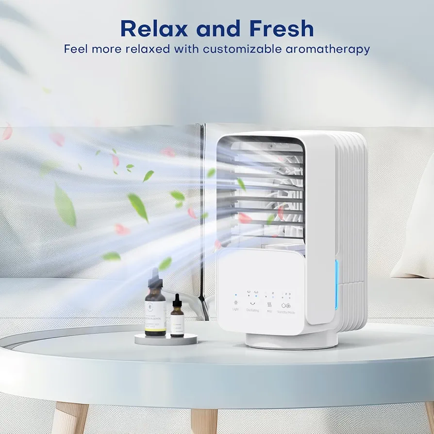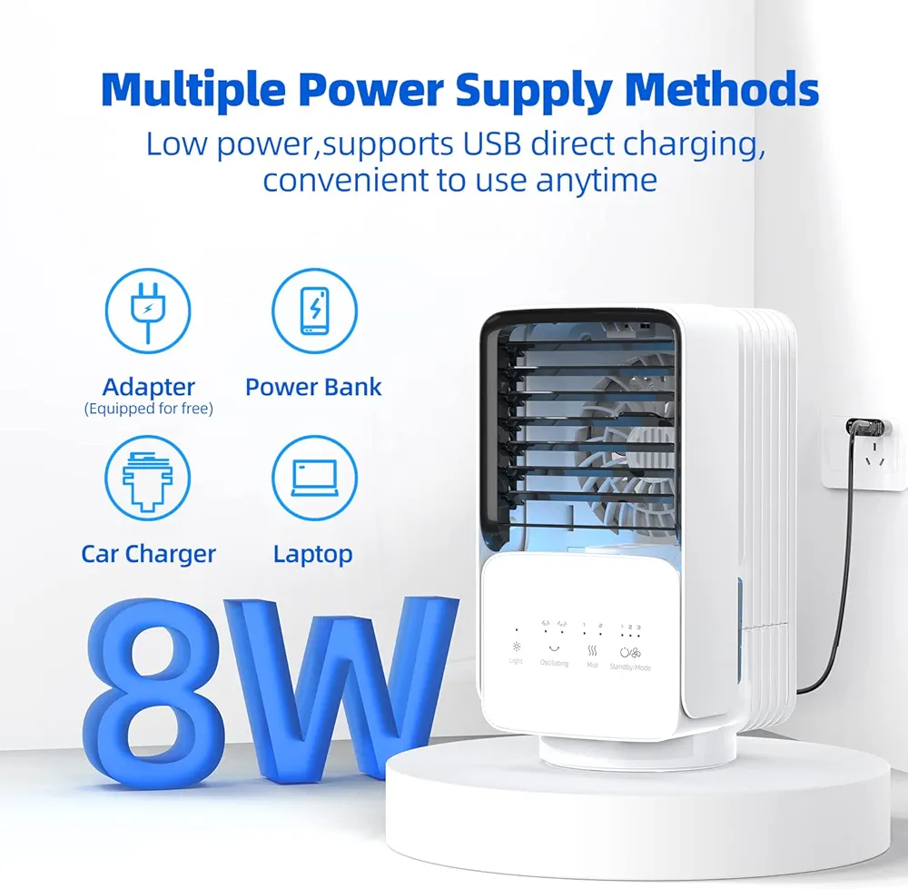 ☃️ فناوری خنککننده منحصر به فرد: کولر کوچک از فناوری مه اولتراسونیک برای اتمیزه کردن آب به صورت مه ریز استفاده میکند که سپس توسط فن توزیع شده و هوای خنک و مرطوب را فراهم میکند. میتوانید از بین حالتهای مختلف مهپاشی، رطوبت را افزایش داده و در نتیجه به طور موثر ناراحتی ناشی از خشکی هوا در تابستان را تسکین دهید.