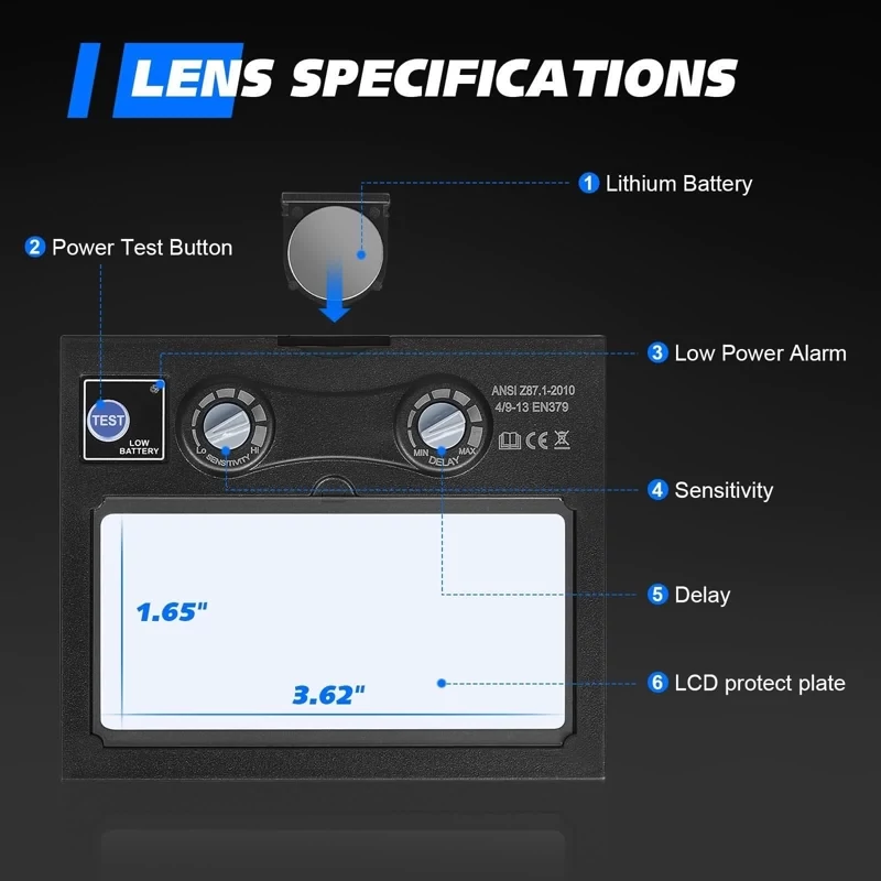 🌞1. میدان دید بزرگ: از فیلترهای کریستال مایع و لایه نوری با کیفیت بالا استفاده شده است . ناحیه دید فعال 92.5 میلی متر در 42.5 میلی متر است که به هنگام جوشکاری میدان دید بزرگ تری را می دهد. و دارای حفاظت دائمی UV/IR (DIN 16) است تا اطمینان حاصل شود که اپراتورها از اشعه های مضر مانند اشعه UV/IR آسیب نمی بینند. 🌞 2. کلاه جوشکاری قابل تنظیم: ماسک جوشکاری خورشیدی نور متغیر اتوماتیک دارای یک هدبند قابل تنظیم بهبودیافته و راحت، طراحی متعادل برای موقعیت های بالا و پایین، تناسب بدون لغزش را فراهم می کند و دست های کاربر را کاملا دور نگه می دارد. ماسک جوش پلاستیکی ABC PP تنها 0.97 کیلوگرم وزن دارد که سبک وزن بوده و برای کارهای طولانی مدت مناسب است. 🌞3. تاریک شدن خودکار: ماسک جوشکاری مجهز به دو سنسور فیلتر سایه مستقل با تنظیمات حساسیت و تاخیر داخلی است که می تواند با محیط های مختلف و مدت زمان کار سازگار شود. زمان تعویض 3/10000S است و برای محافظت از چشم و سر، به طور خودکار در حین جوشکاری به سرعت تیره می شود. 🌞 4. کار با سلول خورشیدی: ماسک جوشکاری کم نور خودکار با باتری توسط فناوری پنل خورشیدی تغذیه می شود و عمر طولانی تری ارائه می دهد. حساسیت و سایه تیره را به صورت دستی با توجه به نیاز خود تنظیم کنید. DIN 4 در شرایط روشن و DIN 9-13 در حالت تاریک است. 🌞5. کلاه جوشکاری تاریک خودکار: کلاه جوشکاری تاریک خودرو از 2 حسگر ARC استفاده می کند، این طراحی به لنز اجازه می دهد تا از روشن به تیره در 3/10000 تغییر کند، از چشم ها به شدت در برابر آسیب محافظت می کند. و با خیال راحت جوشکاری ARC/MIG/TIG را انجام دهید.